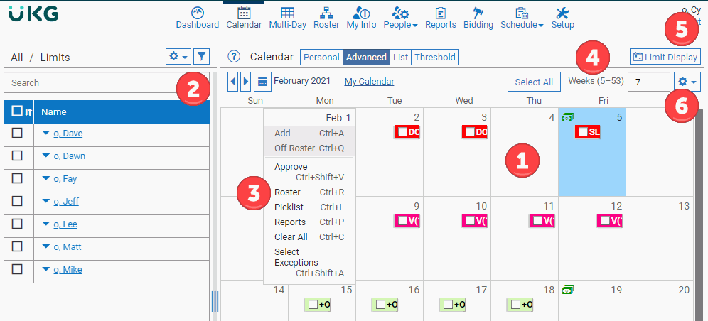 | 2 | People Filter: The People Filter and capabilities within are available in the Advanced calendar. Use the People Filter list to select multiple people and apply the same work code in one transaction. |