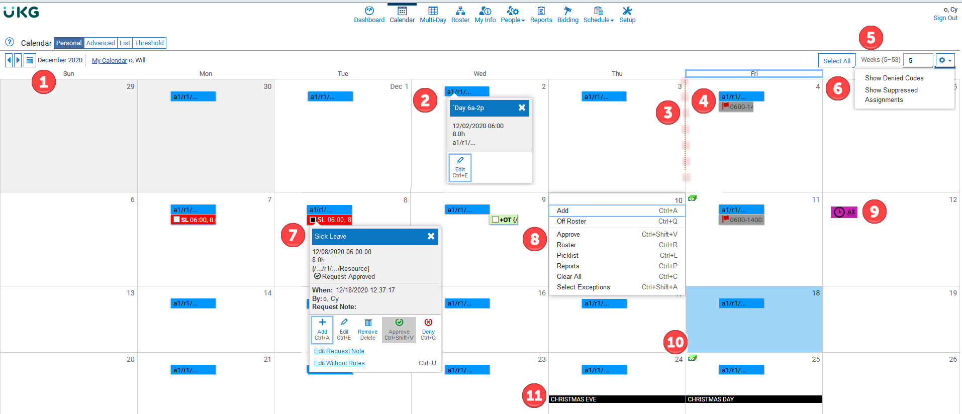 | 5 | Select All - Selects all of the exceptions within the number of weeks in view. Weeks (5-53) - Controls the number of weeks within view. Relevant information for the corresponding number of weeks display on the Calendar. The default is 7 weeks within view. |