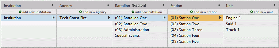 Example: Captain Cynthia Peterson has the authority of Staffer Advanced which is set to an organization level of Battalion (Region). She has an Assignment in Battalion One. Based on the organizational structure in the preceding image and her assignment area, she can only affect station and unit records contained within Battalion 1.