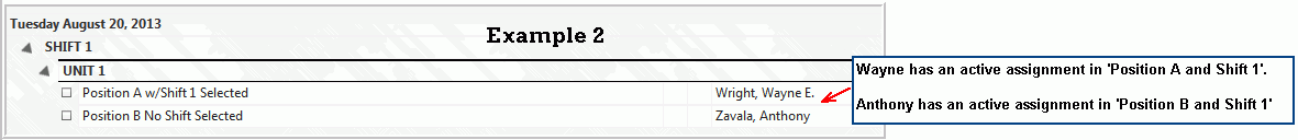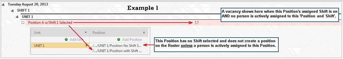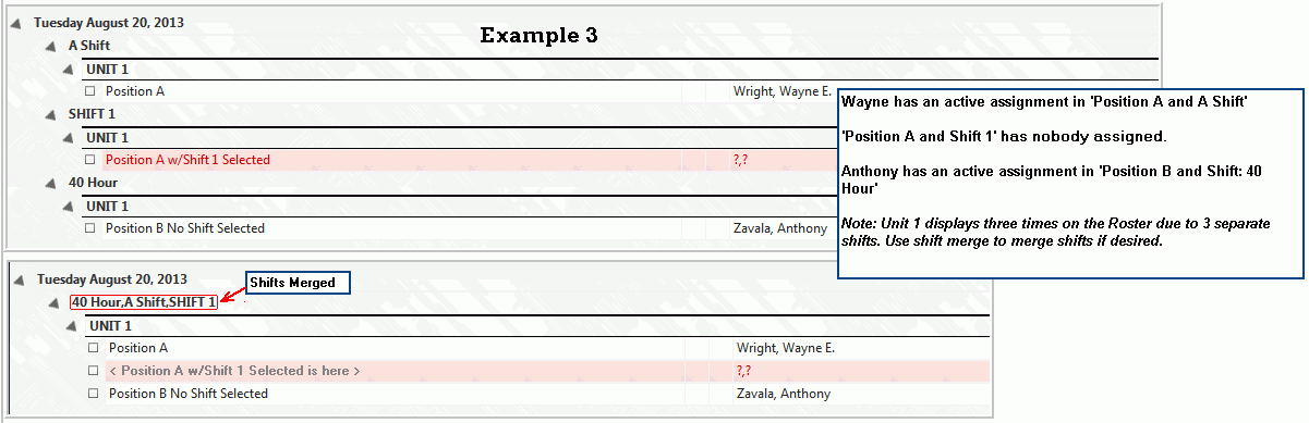 Example 3: In this example only the Positions match - not the shifts. Notice how it breaks the units on the Roster into three distinct units. This is an example of what happens in the application when varying shift times work in the same area.