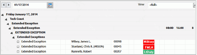 The Roster image area below shows an area on the Roster for extended exceptions. Customers have created areas similar in concept, like Extended Leave, Light Duty, and Special Assignment to tidy the Roster and run rules at optimal levels. Additional units may be created to better fit your needs, however be careful not to clutter the Roster with too many units.