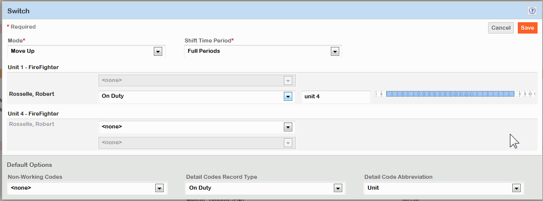 To keep track of personnel moves when using the Switch feature use the Detail Code Record Type and Detail Code Abbreviation settings on the Switch screen. The information selected in these settings will help keep track of where personnel was previously staffed.