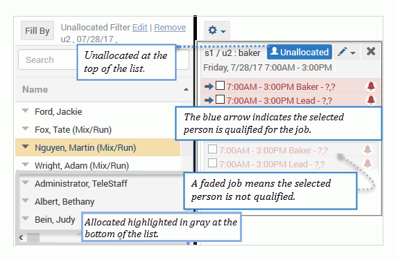 The Unallocated feature available on each of the pin boards returns unallocated resources that match the job’s entire vacancy period when turned on.