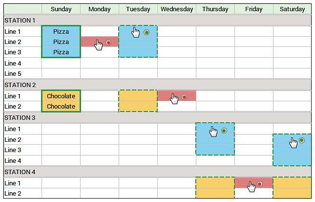 Station 1 contains five lines. Station 2 contains two lines. Station 3 contains 4 lines. Station 4 contains 2 lines. Station 1 contains three blueprints to produce pizza on Sunday in Line 1, Line 2, and Line 3. Station 2 contains two blueprints to produce chocolate in Line 1 and Line 2. The radio button in red indicates paste fails, the radio button in green indicates paste applies.
